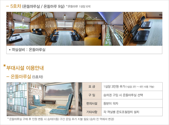 다른 기차들과는 달리 마루의 특성 상 다리를 뻗고 갈 수 있고, 누워서 갈 수도 있습니다. 여기에 따뜻한 온돌에서 오손도손 이야기 꽃을 피울 수 있다는 점이 매력인데요.
